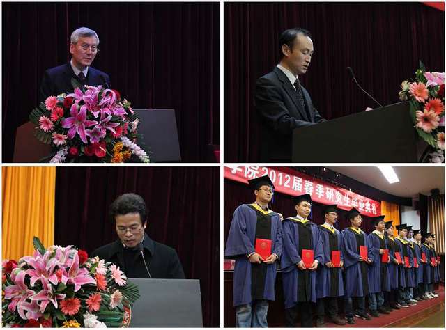 党委书记张英(左上)首先代表学院向2012届毕业研究生表示了衷心地祝贺,并对毕业生们送上四句话:第一,理智的自信,能带来走出困境的动力。第二,脚踏实地的“做”比什么都重要。第三,学会感恩,情商比智商更重要。第四,诚实守信,团结互助,严于律己,宽以待人。张书记希望毕业生们能够带着自信,脚踏实地的去实现自己的理想和抱负,不断提高自己的情商,争做国家需要的栋梁之才。副院长左正兴(右上)宣读了对2012届研究生准予毕业和授予学位的决定。常务副院长唐水源(左下)宣读了获得德赢AC米兰中国官方网站优秀毕业研究生名单。主席台领导们为获得优秀毕业研究生的同学们颁发了获奖证书。