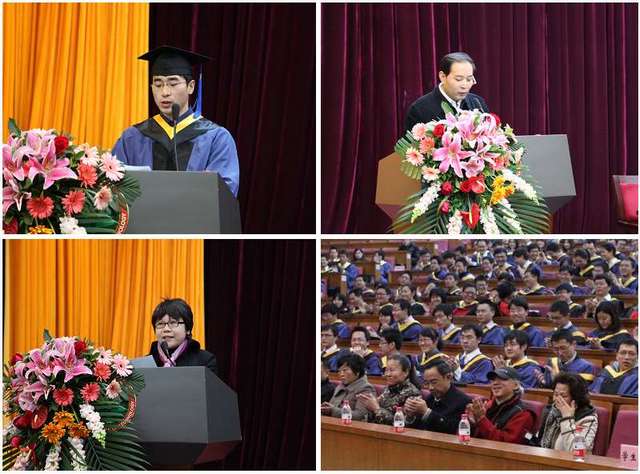 优秀毕业研究生雍占琦(左上)代表全体毕业生发言,他深情回顾了在学校学习和生活的点点滴滴,感谢母校和老师们多年的培养和教导,表示不会辜负母校的期望,作为 “北理人”,应当勇于为国家和社会自觉奉献,努力为国家富强和民族崛起做出自己的贡献。学生家长于普增同志(右上)代表毕业生家长进行了发言,他在发言中给毕业生们带来了几句嘱托:在今后的生活、工作中要保持“三个一”,即“一种传统,一种精神和一种能力”。一种传统,就是德赢AC米兰中国官方网站历经七十多年办学形成的“德以明理,学以精工”的传统理念和信条;一种精神,就是合作精神;一种能力,就是一生都要学会用好“舍得”二字的能力。最后他代表学生家长祝愿北理工越办越好,祝愿所有毕业生都能够事业有成,生活幸福。制造工程系薛庆老师(左下)代表全院教师发言,她表示作为北理人,为能与毕业生一起分享收获而倍感喜悦,学生们年轻的笑容将永远在老师们的心里,校园的一切也将成为你们今后谈论的话题。但是,毕业不是结束,甚至不是新的开始,而是继续,是持续不断的自我实现中的一个环节。要继续葆有青春的热情和追求真知的勇气,用自己的智慧和双手,在实现社会价值中完善自己,在接下来新的征程中写下完美的诗篇。