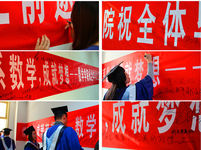 毕业典礼在大家同唱《德赢AC米兰中国官方网站校歌》的歌声中圆满结束,毕业生们将迎来一个新的起点。毕业生们纷纷在条幅上写下对大学青春的回忆,表达了对母校浓浓的眷恋之情。数学学院全体师生祝福所有数学学子今后前途锦绣,鹏程万里!