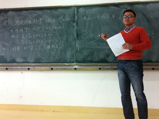 4月25日至5月26日,庞涛教授为数学学院2009级本科生(数学与应用数学,信息与计算科学、统计学三个专业)讲授“金融数学”课程,课程选用美国加州大学伯克利分校Sheldon M.Ross教授所编写的经典英文原版教材《An Elementary Introduction to Mathematical Finance》,采用中文和英文双语进行讲授。