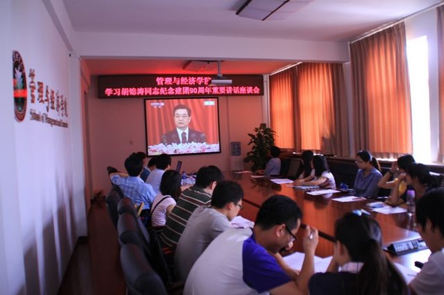 2012年5月10日中午1时,管理与经济学院学习胡锦涛同志建团90周年重要讲话座谈会于主楼418举行。管理与经济学院党委书记李金林,分团委书记彭明雪,分团委副书记张瑞,以及09级本科、11级研究生团支部书记,各学生组织骨干参与了本次座谈会。
