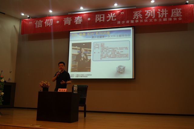 为了引导广大团员青年树立崇高信仰、锤炼火热青春、保持阳光心态,在学校团委的大力支持下,机械与车辆学院团委于2012年6月12日晚举办了“信仰•青春•阳光”主题报告教育活动,邀请我校机械与车辆学院校友、漫步者公司董事长张文东先生来校作报告。报告会由机械与车辆学院院长助理范文辉主持。校团委书记蔺伟代表学校共青团组织致辞。蔺伟老师在致辞中说,“信仰•青春•阳光”系列活动是校团委为进一步做好共青团思想引领工作、大力宣传社会主义核心价值体系、结合迎接党的十八大胜利召开以及纪念建团90周年,在学校共青团系统中开展思想引领工作的重要举措;此次活动能邀请到“工商翘楚”杰出校友张文东先生开展讲座活动,对于扩大学生视野、增进新老传承、提升“信仰•青春•阳光”主题教育活动的实效具有重要作用;并代表学校广大团员青年对张文东回到母校参与人才培养工作表示衷心感谢。