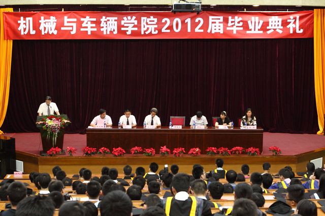 2012年6月15日上午9:00,机械与车辆学院老师和全体2012届毕业生在中心教学楼报告厅隆重举行毕业典礼。到场的学院领导有院长项昌乐、常务副院长唐水源、副院长胡纪滨、副院长左建华、副书记副院长阎艳,教师代表张京英。典礼由机械与车辆学院院长助理范文辉主持。