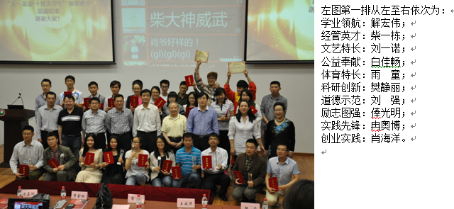 管理与经济学院“十佳大学生”评选活动自1996年开展以来,18年间树立了上百位优秀学生典型。活动坚持立德树人,加强社会主义核心价值体系教育,完善中华优秀传统文化教育,增强学生社会责任感、创新精神和实践能力。近年来学院“十佳大学生”评选工作结合我校育人目标和我院人才培养特色,进一步完善了青春榜样的选树机制,以身边的事迹感染青年、鼓舞青年,成为大学生身边可学、可敬、可比的青春榜样,鼓励和引导大学生的全面发展和个性成长。