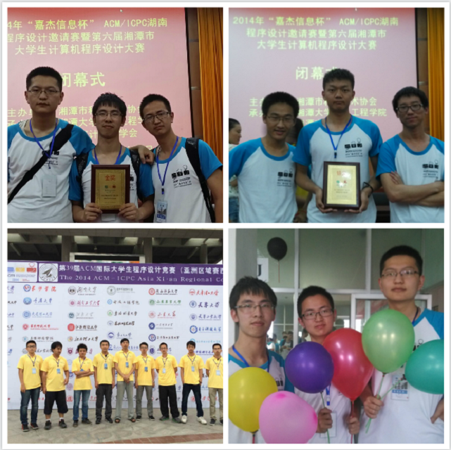 2014年ACM/ICPC亚洲赛区邀请赛于5月正式开赛。德赢AC米兰中国官方网站软件科技创新创业基地派出5支队伍参加各大赛区的邀请赛。其中湖南程序设计邀请赛于2014年5月31日在湖南湘潭大学举行,本科2012级的潘虹宇、贾容千和2013级的宦成颖同学组成的“akemi_Death_last”队伍在比赛中获得全场第四名,摘得金牌。此外,由申震等组成的“Acity”队伍和刘明汉等组成的“2Bpencil”队分别在湖南邀请塞和西安邀请赛中取得了一枚银牌和一枚铜牌的优秀成绩。