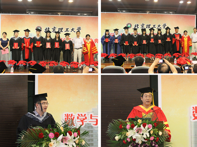 之后由学院领导为毕业生优秀毕业生颁奖,并由毕业生代表徐凯同学发言,他与大家一起回忆大一的懵懂以及大学四年在学业和阅历上的成长,并祝愿数学与统计学院越来越好,老师们工作顺利,同学们鹏程万里。蒋立宁教授代表教师发言,他将这次毕业典礼及以后的日子比作一次没有标准答案的开卷考试,毕业之后步入社会,成绩好坏将由社会评判。蒋老师嘱咐同学们要在这次没法补考的考试中,对自己的人生负责,合理科学的规划人生的每一步,超越自我战胜自我。