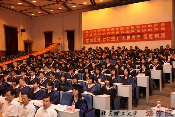 毕业典礼上,教师代表郭德忠老师以“物质化时代的法律人”为题发言,希望毕业生“堂堂正正做人,踏踏实实做事”,并祝贺毕业生圆满完成学业;优秀校友代表96级毕业生、现任 百泰酒业副总裁刘巍发言,表达了对母校的深深怀念和对学弟学妹们的真挚祝福;本科毕业生代表舒歆同学发言,表达了全体毕业生对学校领导和老师的感激之情和崇高敬意;研究生毕业生代表姜琨琨发言,表达了对母校的留恋和对同窗未来的祝愿,并带领全体毕业生宣誓,“传承谦虚谨慎、自强不息的理工传统;发扬团结勤奋、求实创新的理工精神;志存高远,锐意创新;勤勉做事,谦虚为人。用才华和智慧肩负起民族复兴的使命;用青春和热血承担起国家富强的责任。”的豪言壮语在报告厅中回响。