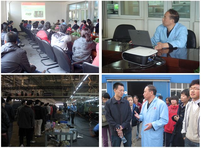 首先,负责此次参观的工厂技术人员杨师傅为同学们详尽介绍了企业的背景与发展历程,然后,通过两个短片又展现了系列车型尤其是“勇士”轻型越野车的风采。同学们对于这一完全自主知识产权的高技术水平的车型表现出浓厚的兴趣和极大的自豪感。接着,同学们在带领下有序的对正在生产运行的整车装配生产线进行参观,期间不仅听取了技术人员的专业讲解,还就关心的问题向杨师傅提出疑问和讨论。在这个环节,同学们沿着整条生产线,了见识了整车由零部件组装到下线的全过程。