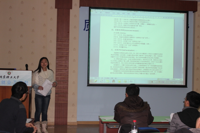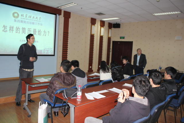 活动以学生演讲、介绍自己及自己的简历,然后老师和同学共同点评的方式进行。活动之初,刘老师抛砖引玉,让同学们进行自我思考,“我为什么要这份工作”、“公司为什么选我”以及“我能为公司创造什么”。还有,公司在浏览简历的同时,也很重视内涵。老师认真地听每一位同学的演讲,从内容到排版、从格式到文字,刘老师都给出了很中肯的建议,同学之间的互动也很活跃,现场的气氛十分和谐。