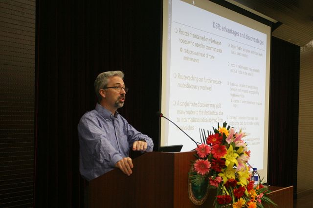 随后,西班牙瓦伦西亚理工大学(UPV) Miguel Sanchez副教授为论坛开幕作名为《Mobile ad-hoc networks》的专题报告,主要对移动特设网络的特点、现状与未来发展等情况做了详细的介绍,现场聆听报告的同学也积极的与Miguel Sanchez副教授进行了良好的沟通和互动。
