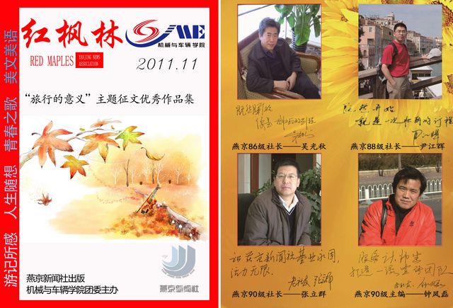 征文结束后,一年一期的脚步征文优秀文集《红枫林》走向同学,走向校园。翻开《红枫林》,映入眼帘的是这样的篇章:行知河山的“游记所感”, 朝气蓬勃的“青春之歌”,体味生活的“人生随想”和温馨隽永的“美文美语”。山不在高,有仙则灵;文章不在辞藻浮华,有真情实感就会令人流连其间。作者的字里行间都透露饱含深情,这是杂志最难能可贵之处。无论是今朝初读此文还是明日回顾彼文,都会惊喜于新的收获。《红枫林》有你的生活,《红枫林》记录我们的脚步。