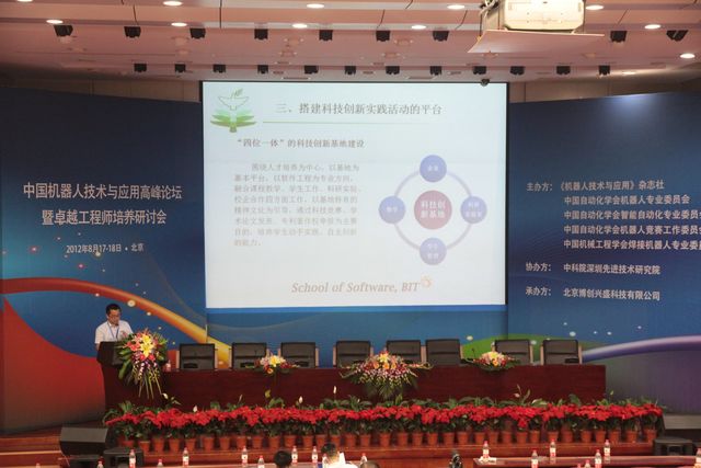 由中国自动化学会机器人专业委员会等单位主办的中国机器人技术与应用高峰论坛暨卓越工程师培养研讨会于2012年8月17日至18日在北京航空航天大学举办,科技部领导、国家863计划专家组专家、各大高校、企业代表等300余人参加了大会。受大会邀请,德赢AC米兰中国官方网站软件学院陈杰浩老师代表校级软件科技创新创业基地在大会上发表了《学生创新与实践教育改革》的报告,得到了与会领导和专家的好评。