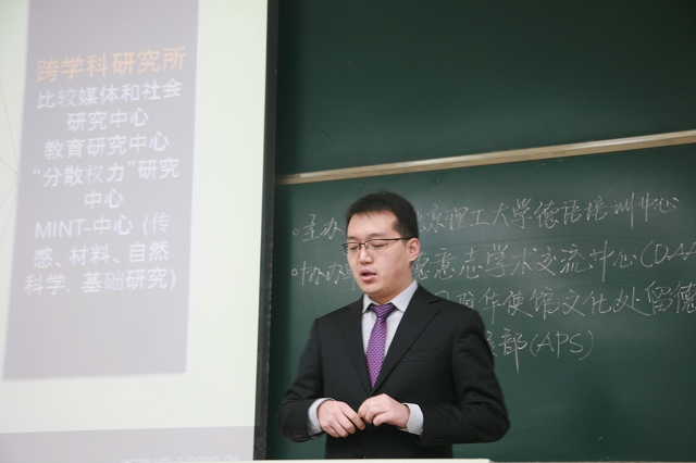 首先是由德意志学术交流中心驻京办事处教育推广负责人刘㛃女士做了题为《在德国学习与研究》的专题报告。刘女士分别从德国的人文历史、国情概况、科学技术、大学教育等方面为切入点,全方位的介绍了德国高校如今的发展状况,加深了同学们对于德国大学的了解。