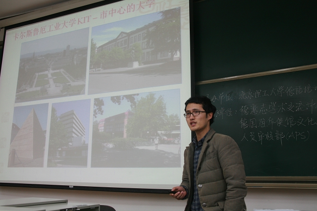 之后来自德国锡根大学北京办事处办公室主任韩丁先生和德国卡尔斯鲁厄工业大学留德专业测试点中方助理张勇博士分别介绍了锡根大学和卡尔斯鲁厄工业大学的系别、课程设置、留学生活等方面的报告,内容丰富,语言幽默,使在座的同学们在愉悦的气氛中了解到这两所大学的基本情况。