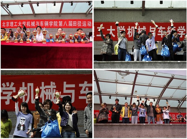 此次比赛共设男子团体奖、女子团体奖、团体总分奖、精神文明奖数项。在比赛结束后,学院领导为获奖班级颁发奖杯和奖品。至此,机械与车辆学院第八届春季运动会在一片欢呼声和积极向上的氛围中圆满结束。作为春季全民健身系列活动的重要环节,学院运动会为全院师生走出教室、积极锻炼身体提供了良好的平台,对于激发全院师生的健身热情和积极性起到很大作用。学院春季全民健身系列活动后续还会有针对毕业生的离校主题教育—“青春飞扬的季节”主题文体活动等,欢迎全院师生积极参与。