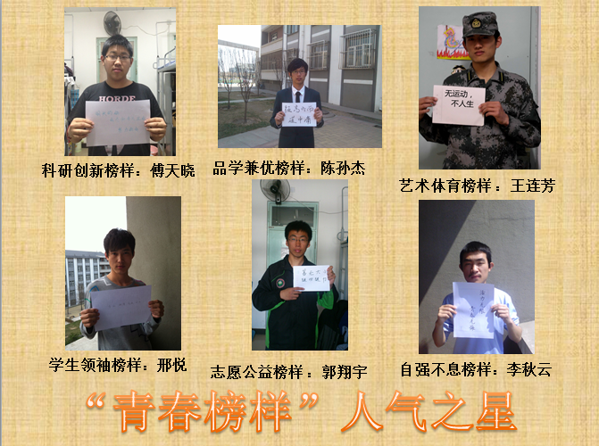 为弘扬先进精神,树立优秀榜样,鼓励优秀个人继续努力,基础教育学院信息与电子第二学部团总支于2013年4月开展青春榜样“人气之星”评选活动。此次活动在科研创新、品学兼优、学生领袖、艺术体育、志愿公益、自强不息六类青春榜样中评选“人气之星”,使各位同学能够了解身边榜样,向榜样学习。