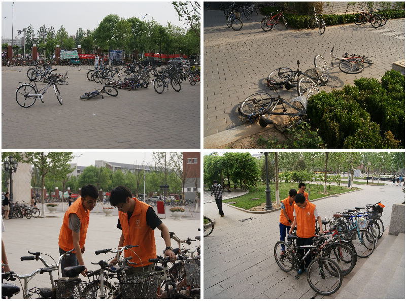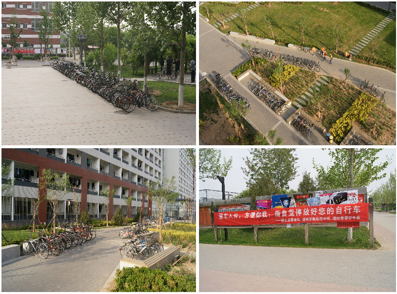 最终,经过同学们自行评审投票,选出最具时效性实施解决的问题为“自行车摆放混乱”。此问题在网络平台上,引起了许多同学关于“文明只差一小步”的共鸣。于是,理材学部学生会整合了大家的建议,制作出了自行车摆放规划图,并以传单形式发放到同学们手中;志愿者们同时展开为期一周的自行车摆放指挥工作,指导、督促大家正确停放,养成良好习惯,并在各个自行车停放区用各具特色的横幅标语,进行温馨提示。