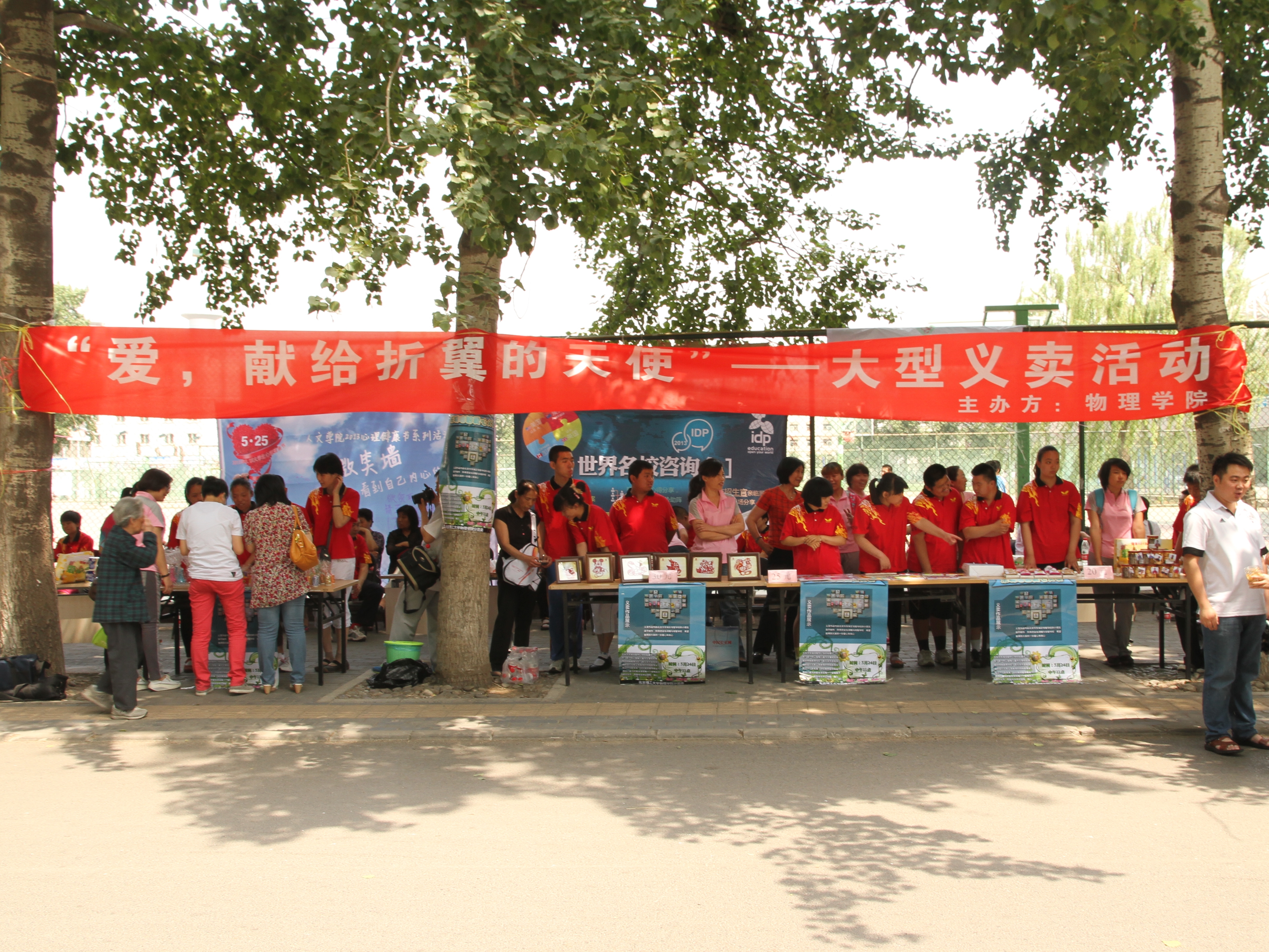 2013年5月24日,爱心传递系列活动之——“智障学生手工艺品义卖”在我校顺利举行。活动当天,来自培智学校的学生带着自己亲手制作的软陶笔筒、花瓶、手机套、剪纸、曲奇饼干等作品,也带着对大学的憧憬和梦想来到校园。菁菁校园也因为他们的到来更平添人文关怀和感恩之情,老师和同学挑选自己喜爱的作品,并和智障学生交流和沟通,给予他们鼓励和温暖。