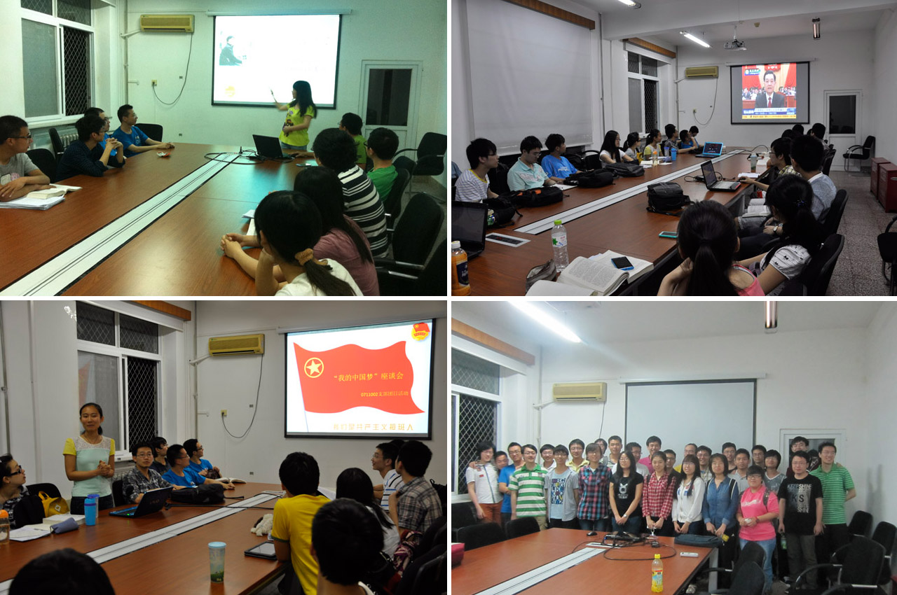 其中10级本科1支部、2支部、3支部和4支部的同学们通过举行座谈、宣讲,观看习近平总书记对于"中国梦"阐述的视频和观看朝闻天下关于"中国梦"的报道新闻,加深同学们对"中国梦"的理解。最后同学们或发表演讲,或交流讨论,分享学习心得,气氛火热。座谈活动激发了同学们对"我的中国梦"的思考,促进了团员们积极向上的态度,鼓舞了团员们践行青春梦想的激情。