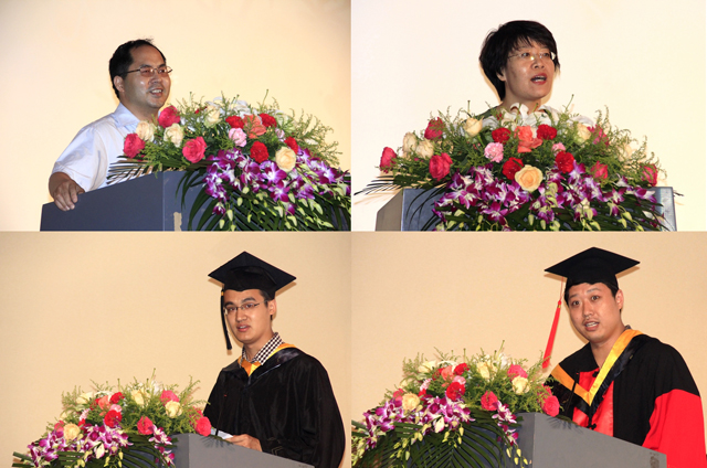 学生家长代表郝金梅女士,感谢四年来学校学院给学生成长成才提供了良好的平台,嘱咐孩子们:“永远不要忘记恩师,永远不要忘记母校,永远不要忘记奋斗”。优秀本科生代表程思源和研究生代表丛炳龙博士代表全体毕业生感谢老师们的培养和教导,表达了同学们对奉献社会、建功立业的信心和决心,以及对母校的依依不舍之情和美好祝愿。