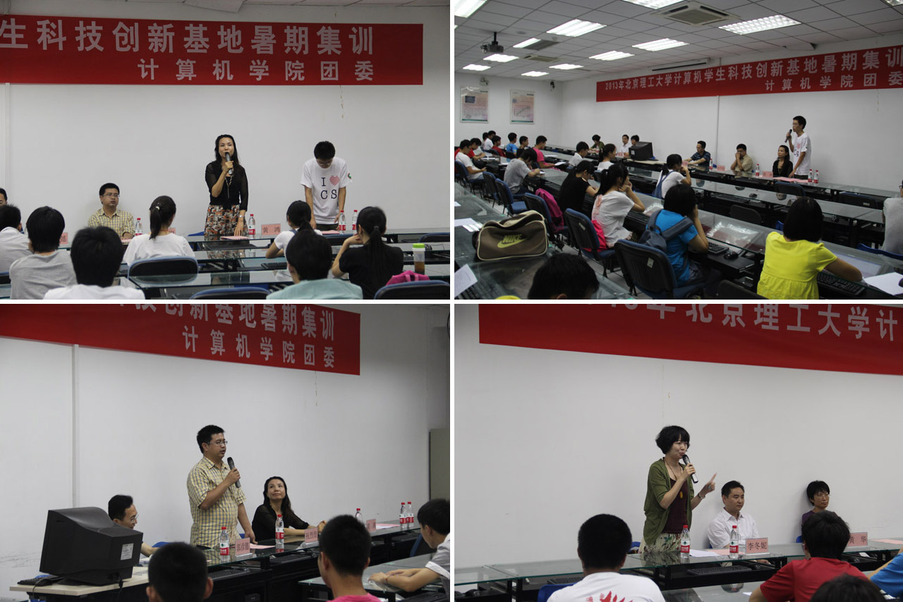 刘贺老师总结了集训的筹备情况。今年暑期集训得到了学校相关部门的大力支持,经过近两个月的准备,共有来自计算机学院、自动化学院和信息学院的131名同学报名参加,其中12级学生71人,11级学生25人,10级学生15人,ACM集训队20人。共收到教师提供项目20余个,结成创新项目小组8组。他对参训同学做了安全教育,特别强调了警惕用电安全、营造良好学习氛围、注意个人和环境卫生等事项。