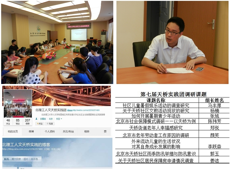 区校联手,共建社区。2013年暑期,德赢AC米兰中国官方网站人文与社会科学学院再度与西城区天桥街道合作,开展了第七届天桥社区大学生主任助理社会实践项目。自2007年起,每年暑期的天桥实践项目已经成为北理与天桥街道之间一个美丽的约定。