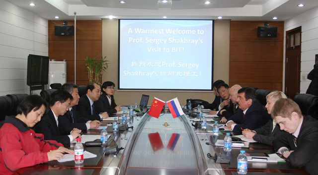 一一2014年2月25日上午,俄罗斯莫斯科罗曼诺索夫国立大学副校长沙赫雷(Sergey Shakhray)率领莫大代表团,在俄罗斯驻华使馆一秘巴尔然诺娃(Barzhanova)的陪同下访问北理工,赵长禄副校长在2号楼133会议室会见了代表团一行。