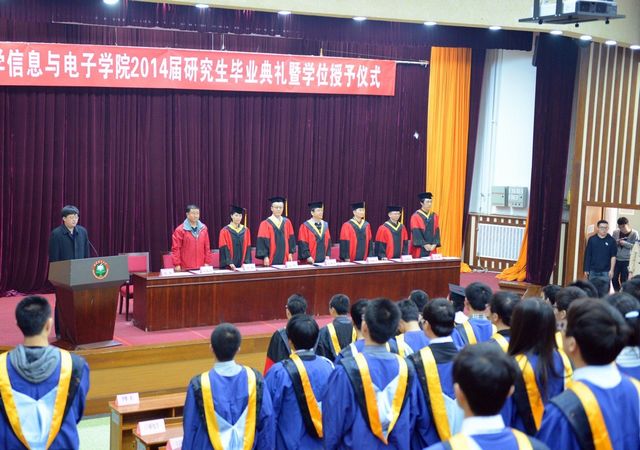 伴随着掌声、祝福声,信息与电子学院2014届研究生学位授予仪式隆重举行。院长龙腾、党委书记安建平、副院长徐晓文、副院长杨静以及教师代表刘峰为2014届毕业生授予学位。