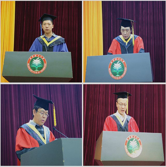 2014届春季毕业生代表杨行上台发言,他满怀深情地回顾了在北理工研究生求学生涯中难忘的点点滴滴,表达了毕业生对母校的深深眷恋。并且感谢老师的培育之恩,感谢同学们的热情投入和乐于分享,感谢家人和朋友的一贯支持,并号召同学们不忘感恩和回馈,承担社会责任,造福社会。