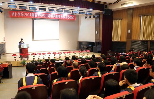 3月25日下午,材料学院2014届春季研究生毕业典礼暨学位授予仪式在7号教学楼报告厅隆重举行,材料学院党委书记陈鹏万、常务副院长刘颖、副院长庞思平、副院长金海波、副书记副院长张舰月和教师代表、毕业生亲友及全体2014届春季毕业生出席本次典礼。典礼由硕士毕业生孔琳琳主持。毕业典礼在庄严雄壮的国歌声中拉开了帷幕。